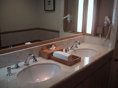 ラウンジの化粧室洗面台 ブラシ、お手拭タオル(紙ではありません)あります。  |