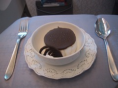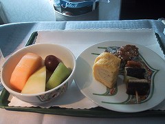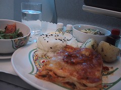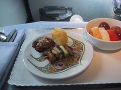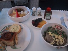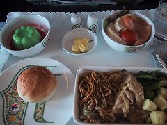 向こうの世界は一体どうなっているんだと関心大でした。 行きは満席に近く、食事時、客室乗務員がそれだけ動く距離が長く、回数が多いので、なんか落ち着かない。 席は前の人がリクライニングを思いっきり倒すと、テレビのモニターが目の前にくることもなく、広くて楽だし、気兼ねなく使えます。 テレビ画面も大きく見やすく、オーディオは自分の聴きたい曲をセレクトして、記憶できました。(テレビ、オーディオは国際線のみ) チェックインカウンターが長蛇の列でも、VIPラインはすいています。 帰りの便は空いていて、客室乗務員もよく気を利かせてくれました。 食事は見ての通りおいしくいただきました。 多分2度と経験できないでしょうが、贅沢な飛行を体験できました。  |