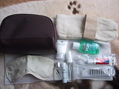 アメニティーキット。スリッパは頼んだらいただけました。 ポーチがしっかりしています。 リップクリームがうれしい。 2人で往復で4つそろいました。(笑)  |